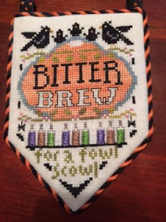 When last I wrote, I talked about my next project being, Hands on Design's "Apothecary Series", and I have had my issues with this series (operator error), but I have loved each finish. I've not finished the entire series yet, as you can see, but I'm hoping to finish the final 3 before next Friday and will have it hanging in the shop. Love It. I started with "Bitter Brew". I had picked a fabric, but when Sara saw it she had a different one in mind so I decided to go with her decision. Since I really felt as long as the fabric color was light all the designs would pop. Sara picked 32 ct. Pale Lilac linen. I pulled the Classic Colorworks fibers recommended as I was going to do it exactly as shown on the charts, however, I didn't have the called for Kreinik threads so I pulled threads that closely matched the called for colors (or I just liked them). So I instantly decided instead of Zach Black I'd just use the DMC black as it popped more on the fabric. After that, I used the called for flosses for the rest of the piece. I failed to note that I was supposed to use a specialty stitch on the bottles, and instead did the cross-stitch in Kreinik and then satin stitched over that with the Kreinik. It really makes the bottles stand off the linen. I also used the #4 black Kreinik to make all the spiders on the series. Then after I finished the stitching I decided to do the finishing as well right away. A couple at a time would be easier than doing all of them at once (I thought), After looking at different options for finishing, I finally settled on the following for all pieces. I cut 2 mat boards for each piece, glued scrapbook paper to the back of one piece, put a piece of batting on the front piece, attached the stitched piece to the batting mat board, cut 2 two-inch strips of the orange/black ribbon and made 2 loops for each piece which I glued to the back piece of mat board on the side that would be glued to the front mat board. Yes